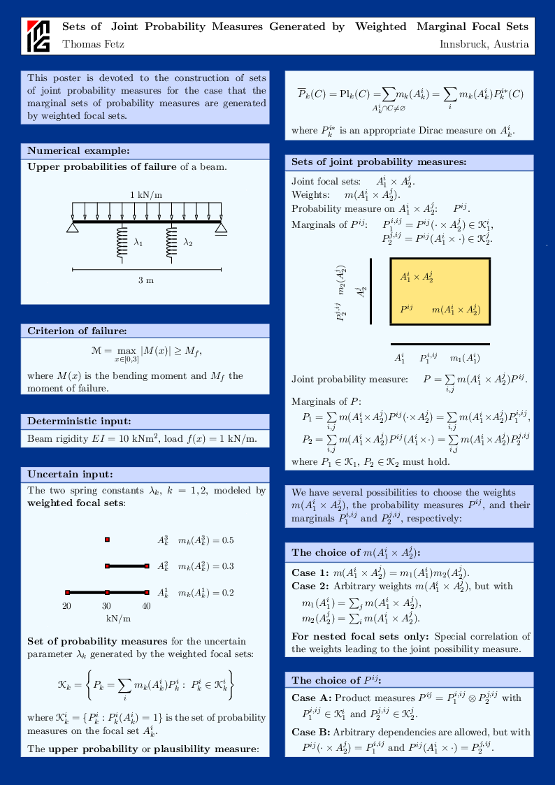- Th. Fetz (2013). Limit state functions and parameter-depending uncertainty described by sets of probability measures. In: ÖMG - DMV Congress 2013. 18th ÖMG Congress and Annual DMV Meeting. University of Innsbruck, September 23 – 27, 2013. Innsbruck: Leopold-Franzens-Universität Innsbruck / Österreichische Mathematische Gesellschaft - ÖMG, 146.(Weblink)