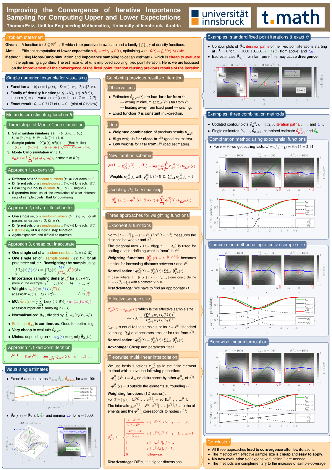 - M. C. M. Troffaes, Th. Fetz, Thomas, M. Oberguggenberger (2018). Iterative importance sampling for estimating expectation bounds under partial probability specications. In: De Angelis, Marco: REC 2018 -Proceedings of the 8th International Workshop on Reliable Engineering Computing. Liverpool: Liverpool University Press, 147 - 154.