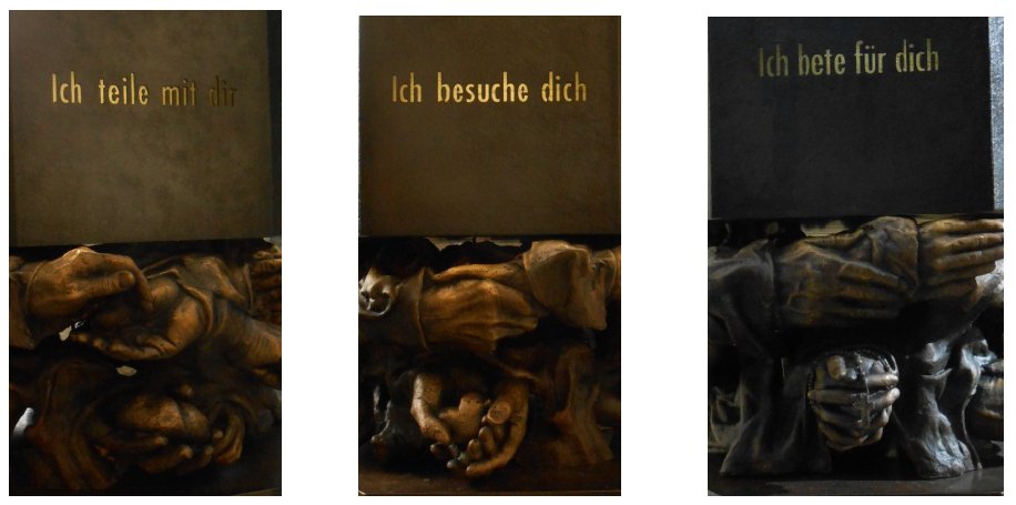 Diese Hände sind jedoch keine künstlichen, sondern reale Hände von Menschen aus dem Lebenskreis des Künstlers. Vielleicht haben mich selbst diese Hände schon berührt, grüßend, helfend, anbietend, unterfassend. So wird uns das geheime Band der Gesellschaft ansichtig. Denn jede Gesellschaft lebt letztlich nicht von Konkurrenz und Verdrängung, sondern von Solidarität und Anerkennung. So hält eine Hand ein Brot, eine andere wird vom Rosenkranz geprägt. Was ruht in meiner Hand und möchte zur Gabe werden?