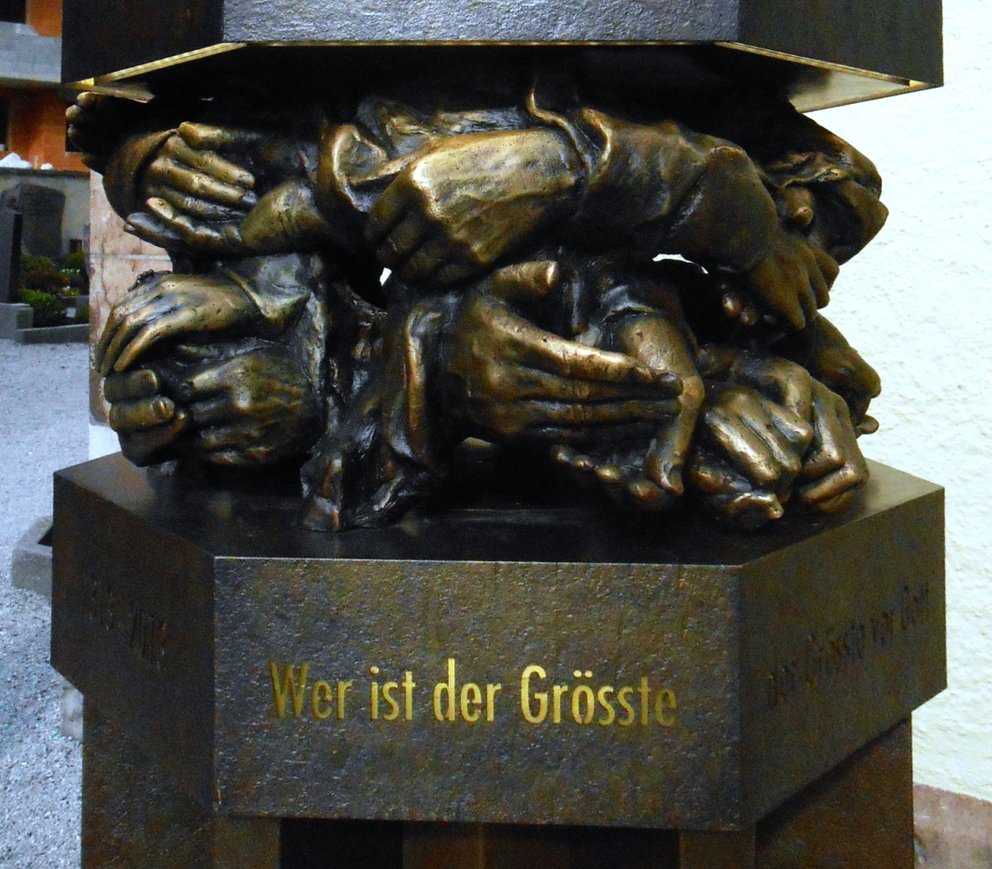 Klar! Die Olympiasiegerinnen, jene, die aus voller Brust singen können: „we are the champions – no time for loosers…“. Und wie sagen sie alle: „Der Zweite ist der erste Verlierer!“ Siegermentalität, keine Durchhänger. So lautet das Credo unserer Tage. Doch diese Stele widerspricht: Die Unterbrechung der Stele verweist auf das Wort Jesu: „Der Größte von euch soll euer Diener sein. Denn wer sich selbst erhöht, wird erniedrigt, und wer sich selbst erniedrigt, wird erhöht werden“ (Mt 23,11-12). Und: „In jener Stunde kamen die Jünger zu Jesus und fragten: Wer ist im Himmelreich der Größte? Da rief er ein Kind herbei, stellte es in ihre Mitte und sagte: Amen, das sage ich euch: Wenn ihr nicht umkehrt und wie die Kinder werdet, könnt ihr nicht in das Himmelreich kommen. Wer so klein sein kann wie dieses Kind, der ist im Himmelreich der Größte. Und wer ein solches Kind um meinetwillen aufnimmt, der nimmt mich auf“ (Mt 18, 1-5). Hier, wie auch vor allem in der Bergpredigt, legt Jesu die Kriterien und die Rangordnung des Reiches Gottes vor. Ihm geht es nicht um Siege, die andere stürzen oder als Verlierer bloß stellen. Gibt es einen Sieg, der andere erhöht und würdigt?