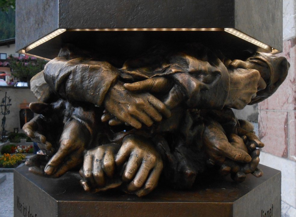 Dem Künstler gelingt dieses Mahnmal in der Form verschränkter Hände, kleine und große, junge und alte, feingegliederte und vom Anpacken gezeichnete. Sie umringen die Stele wie ein Lorbeerkranz. Ja, sie krönen diese Stele, weil sich in diesen Händen das Leben selbst hinein gezeichnet hat. Hände als Spiegel unseres Lebens, Erinnerungen an Schenken und Empfangen. Alles Leben ist Gabe.