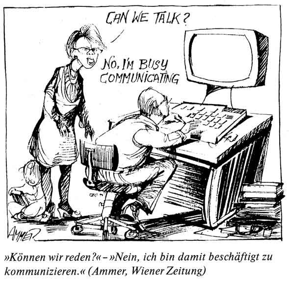 Daß die genaue Bedeutung des Begriffs Kommunikation keine nebensächliche Spitzfindigkeit darstellt, kommt in einer Karikatur (18) sehr gut zum Ausdruck: Auf die Frage der Frau: "Can we talk?" antwortet ihr gebannt auf den Computerbildschirm starrender Mann: "No, I'm busy communicating!"