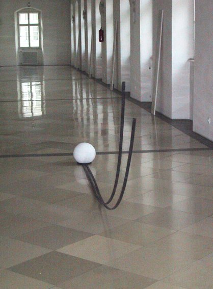 Insofern ist in der vorliegenden Ausstellung ja auch der gesamte Gang-Hof-Komplex nicht nur Hülle für ausgestellte Bilder und Skulpturen, sondern als ganzes ein von ihr ge-staltetes Objekt, gleichsam zusammengehalten durch die Klammer der Installation Metafisica. Es sollte derart durch die Eingriffe, durch das Kräftespiel der Formen Neues über sich, aber auch über allgemein gültige Fragen erzählen.