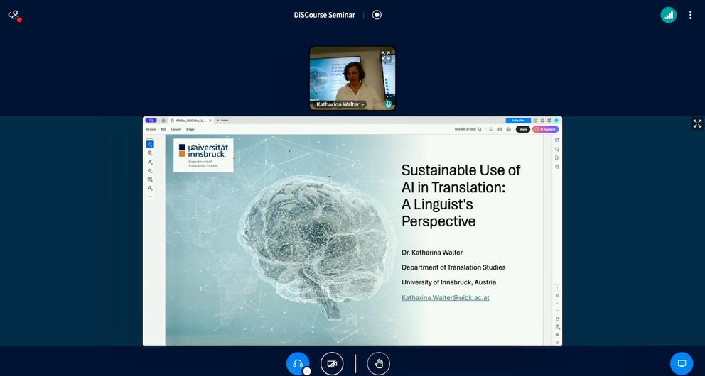Am Freitag, den 03.05.2024, hielt Katharina Walter vom Institut für Translationswissenschaft (INTRAWI) im Rahmen der DiSCourse-Seminare am Digital Science Center (DiSC) einen Vortrag über nachhaltige Verwendung von KI in Translationskontexten. Dem hybriden und gut besuchten Vortrag folgte eine rege Diskussion. Die Aufzeichnung steht unter https://lms.uibk.ac.at/auth/RepositoryEntry/4849139825/CourseNode/109757614524160 zur Verfügung (für Nicht-Universitätsangehörige über den Gastzugang).