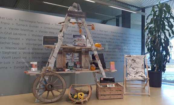 Mit Gräsern und Holz, Heu und Blättern rustikal-herbstlich dekoriert, präsentieren wir vor unserem „Tiroler Wandlexikon“ ein buntes Sammelsurium an verschiedensten Büchern, Postkarten, Flyern und Infomaterialien – zur freien Entnahme!