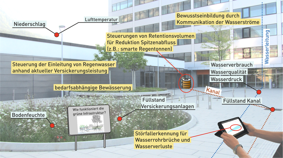 Der Erfolg von „Smart Cities“ basiert auf dem Einsatz von verschiedensten Informations- und Kommunikationstechnologien (ICT) im Zusammenspiel mit der Zivilgesellschaft. Dadurch können Städte systemübergreifend effizienter und nachhaltiger gestalten werden. Die urbane Wasserinfrastruktur garantiert neben der kontinuierlichen Versorgung der gesamten Kommune mit Frischwasser, auch die umweltgerechte Abführung von anfallenden Schmutzwässern und die sichere Ableitung des Regenwassers. Auch wenn bereits die Verbreitung von Echtzeitsteuerungssystemen in den einzelnen Systemen in Ansätzen zu finden ist, werden Wasserversorgung und Siedlungsentwässerung noch als getrennte Systeme angesehen. Eine Trennung der Steuerungsmöglichkeiten des Gesamtsystems ist derzeit aber auch zwischen Endverbraucher und Betreiber vorhanden.