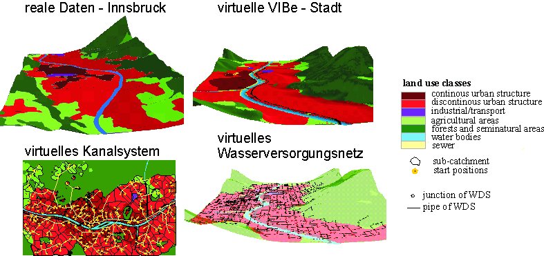 Mit VIBe (Virtual Infrastructure Benchmarking) wurde ein Werkzeug zur algorithmischen Generierung virtueller Fallstudien für Wasserversorgungs- und Abwasserentsorgungssysteme entwickelt. Dabei werden nach der stochastischen Generierung von virtuellen Städten (Geländemodell, Flusssystem, Landnutzung, Bevölkerung, Wasserbedarf, Schmutzwasseranfall, versiegelte Flächen, etc.) mittels computerbasierten Methoden (Agent based models, cellular automata, etc.) nach dem Stand der Technik dimensionierte Wasserinfrastrukturen vollautomatisch generiert. Dabei genügen die generierten virtuellen Wasserinfrastrukturen den Anforderungen der virtuellen Stadt. Nachfolgend werden die Eingabedaten für die fachspezifische Simulationssoftware der Siedlungswasserwirtschaft (EPANET, SWMM etc.) erstellt. Mit diesen Eingabedaten können beispielsweise Simulationsläufe zur Bestimmung der hydraulischen Leistungsfähigkeit der Systeme durchgeführt werden. Die Resultate der Simulationsläufe können anschließend einem Benchmarking auf Stadtebene unterzogen, beziehungsweise stochastisch ausgewertet werden.