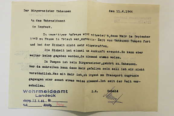 Mitteilung des Bürgermeisters von Umhausen an das Wehrmeldeamt Landeck, 11.4.1944. (Credit: © Tiroler Landesarchiv)