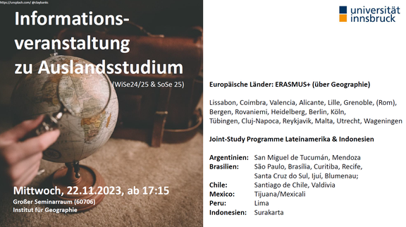 Wir dürfen Sie herzlich auf eine Informationsveranstaltung zum Auslandsstudium (ab Wintersemester 2024/25 & Sommersemester 25) in Lateinamerika, Indonesien und europäische Länder (ERASMUS+ über Geographie) einladen.