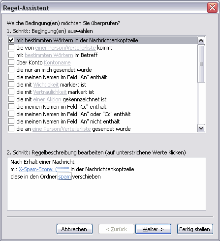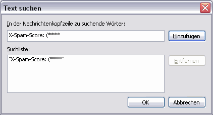 Klicken Sie auf bestimmten Wörtern in der Sektion 2.Schritt und fügen den Ausdruck " X-Spam-Score: (**** " wie dargestellt hinzu, jedoch ohne Anfürungszeichen!