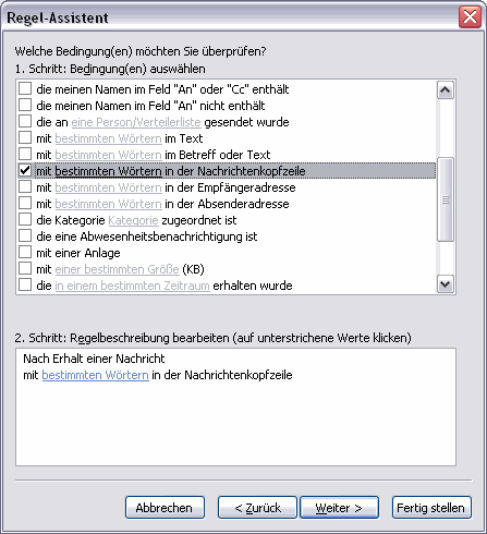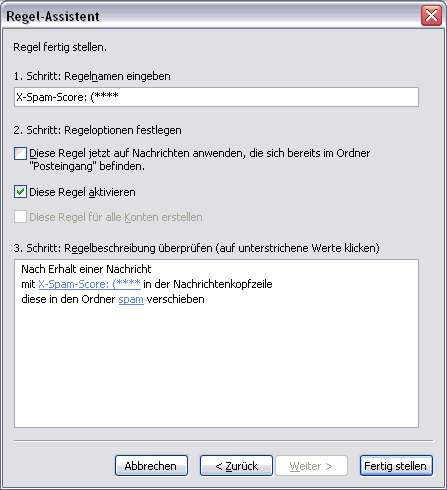 Klicken Sie 2-mal auf weiter, benennen die erstellte Mailregel wie dargestellt und schließen den Regel-Assistent mit fertig stellen.