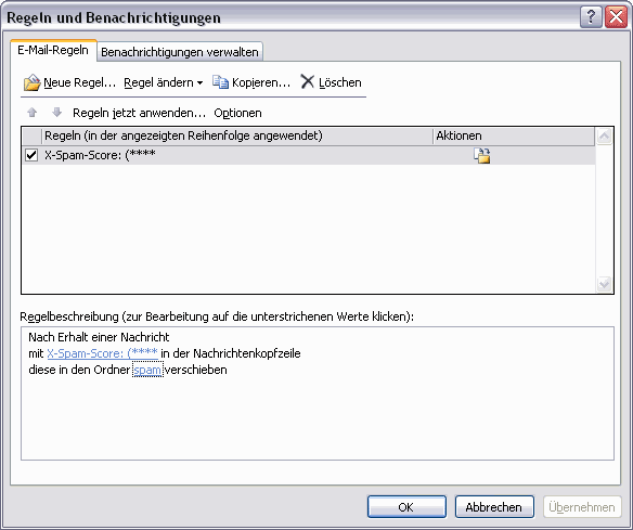 Sie können obige Mailregel auch hier herunterladen und in Outlook importieren. Klicken Sie dazu auf Extras:Regeln und Benachrichtigungen:Optionen:Regeln importieren. Wählen Sie die heruntergeladene Datei aus und bestätigen mit Öffnen und OK. Im Fenster Regelbeschreibung müssen Sie nun noch den Mailordner auswählen, in welchen die E-Mails verschoben werden sollen (z.B.: spam). Bestätigen Sie das Fenster Regeln und Benachrichtigungen mit OK. Künftig werden alle E-Mails, welche 4 oder mehr SPAM-Punkte haben, in den ausgewählten Ordner verschoben.