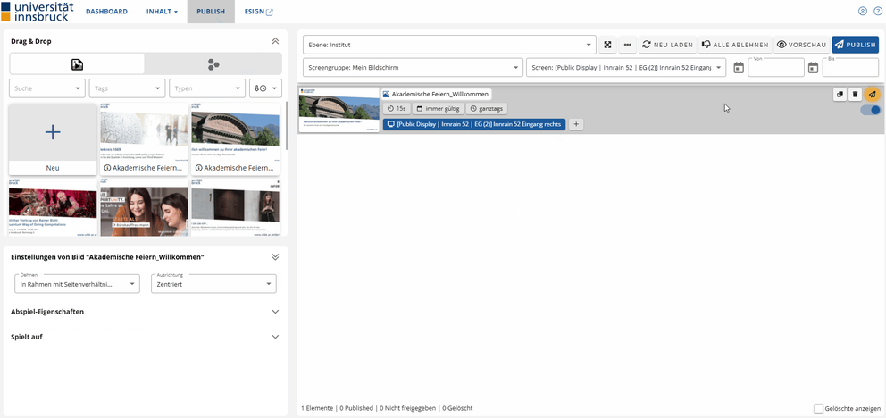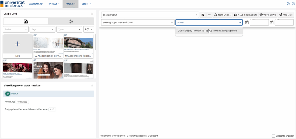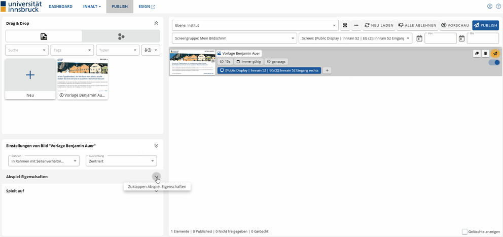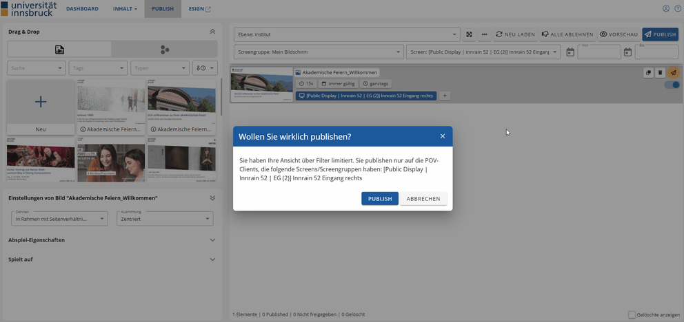 - Nachdem ihr den Inhalt gelöscht habt, müsst ihr erneut auf „Publish“ klicken, damit die Löschung auch auf dem Screen übernommen wird.