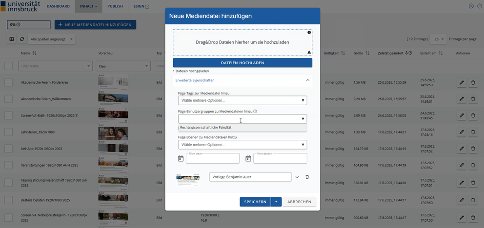 - Benutzergruppe zuordnen: Weist die Datei eurer Benutzergruppe zu, damit sie nur euch angezeigt wird und nicht in den Medienpools anderer Institute oder im BFÖ erscheint.
