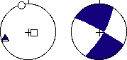 The orientation of the paleostress/strain tensor can be depicted in a tensor diagram (right) or in a beach ball diagram (far right).