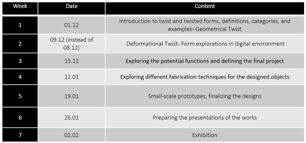 The content of this course includes the fundamental applications of twist in architecture. After a general overview of the definition of twist and its manifestations in nature, art, and architecture, we will explore strategies for generating twisted forms. The course then transitions to experimentation, where participants create twisted forms in both digital and physical environments. The final outcome will be designed objects at various scales and with diverse functionalities.