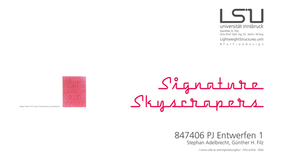 Wir entwickeln und entwerfen auf Basis der eigenen Initialen ein Skyscraper-Konzept. Persönliche Initialen werden als Ausgangspunkt genutzt, um ein individuelles, architektonisches System zu entwerfen, das sowohl räumlich als auch konstruktiv überzeugt.