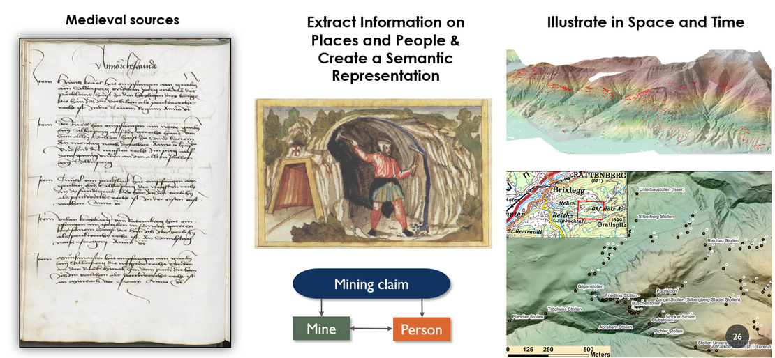 Two historical mining documents "Schwazer Berglehenbuch" (apprx. 1515) and the "Verleihbuch der Rattenberger Bergrichter" (1460-1463) were digitised, transcribed & made publicly accessible. Information regarding the legal relationships between persons, mining claims and mining areas were extracted, represented in a knowledge graph and visualized using digital maps.