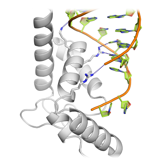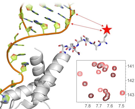 Long-range structural information is derived from paramagnetic relaxation NMR data, using PRE spin labels attached to the protein or the RNA.