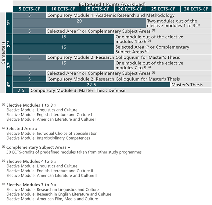 The curriculum can clarify several important questions before you start your studies. For example, which criteria must be fulfilled for enrolment in the Master English and American Studies, how long the programme lasts, which modules must be completed and much more.