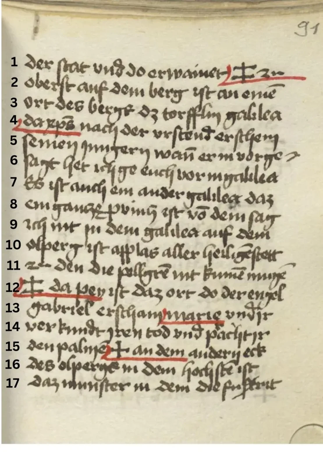 But despite all these obstacles, this page is intended to provide a brief insight into an exemplary page of the prayer book. The page used for this is, as can be seen in the top right-hand corner, the 91st double page, i.e. a “folio” (folio 91r), and therefore roughly in the middle of the entire book.