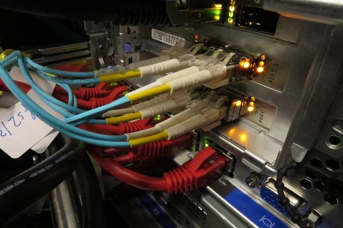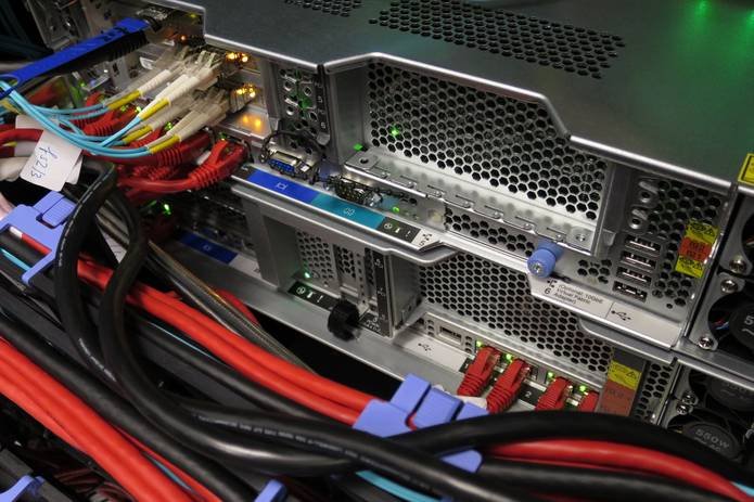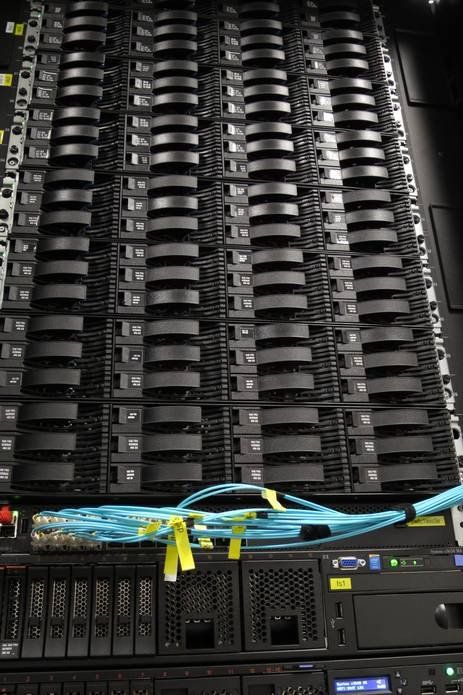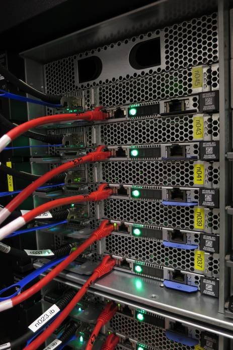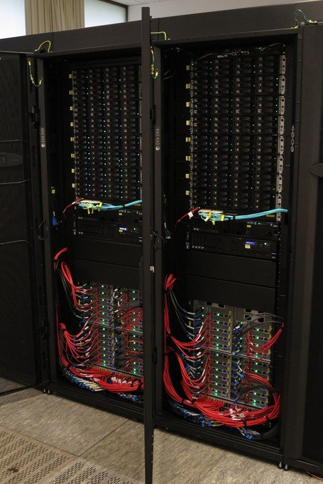 At the top, one can see the disk arrays of the four IBM DS-3400 storage subsystems, the Fibre Channel switches connecting the storage arrays to the two redundant file servers (light blue cables), and a management and login node. Below the two spacer panels, four IBM NextScale chassis, the Ethernet switches (red cables) and the high speed Infiniband switches (black cables) can be seen. All cabling except power is on the front side. MPI data traffic between worker nodes goes over the Infiniband fabric, ensuring low latencies and high bandwidth.