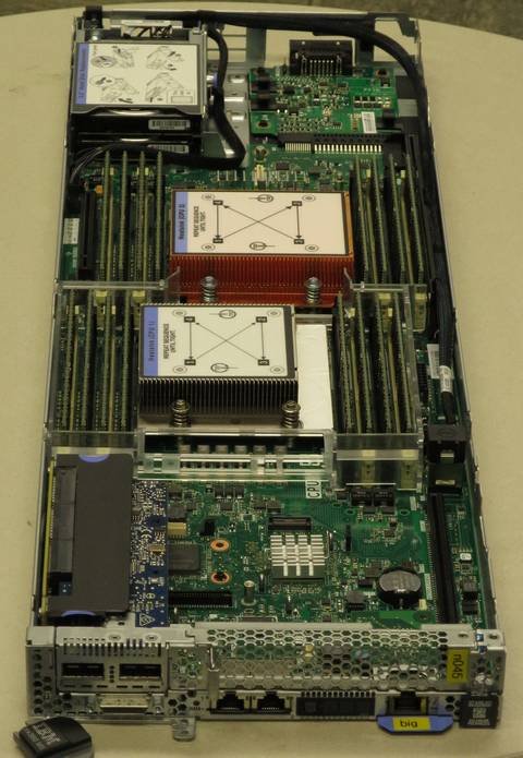 In this inside view from front to back, one can see the main board with the Infiniband mezzanine card (blue, left), the CPU assemblies and memory DIMMs, and the boot disks and power connector of a worker node. Fans and power supplies are not part of the node, but are located in the chassis.