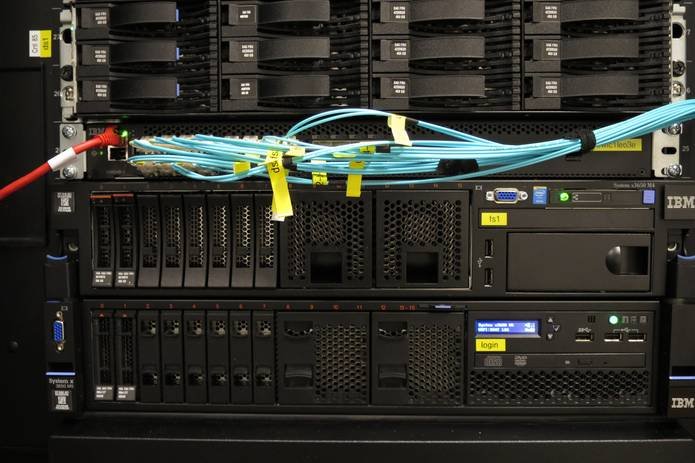 Storage and two file servers are connected by two separate Fibre Channel (FC) switched fabrics. The entire storage configuration (disk arrays, RAID controllers, FC fabric, and file servers) is redundant and has no single point of failure. The file system is IBM's GPFS. The Infiniband connections are also used for GPFS traffic.