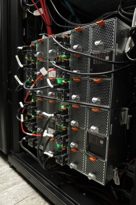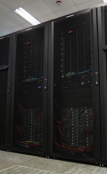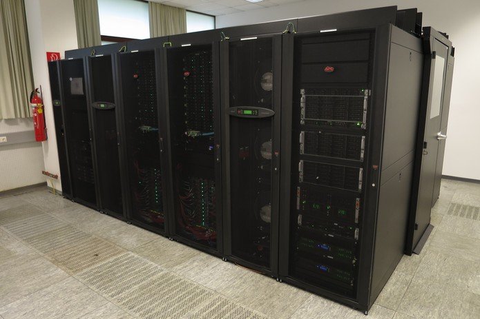 Leo3e is housed in an APC "Hot Aisle" computing center infrastructure together with other servers. Two rows of four racks and two cooling units enclose a central "hot" (30-40°C) aisle separated from the environment by a door and top panels. Air intake and exhaust are physically separated, preventing mixture of cool and warm air. This increases the efficiency of the heat exchangers used for cooling.