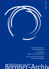 Die Zeitschrift „Mitteilungen aus dem Brenner-Archiv“, die seit den frühen achtziger Jahren Jahr für Jahr regelmäßig erscheint (Nr. 1/1982), informiert zunächst einmal über die Aktivitäten des Forschungsinstituts Brenner-Archiv: über neue Nachlässe, über neue Forschungsprojekte, über neue Publikationen. Darüber hinaus bringt sie wissenschaftliche Beiträge aus aller Welt über AutorInnen bzw. Themen, die mit dem „Brenner“, seinem Umkreis oder den mehr als 170 Nachlässen des Instituts (besonders von „Brenner“-Mitarbeitern und von Tiroler AutorInnen des 19. und 20. Jahrhunderts) in einem Konnex zu sehen oder auch in einen Konnex zu stellen sind; Fachgebiete sind Literaturwissenschaft, Philosophie, (Kultur-)Geschichte. Schließlich werden in dieser Zeitschrift, unter demselben Vorzeichen, auch ältere (verschollene oder früher zurückgedrängte) Arbeiten publiziert, die eine gewisse Aktualität aufweisen, und nicht zuletzt neue literarische Texte.