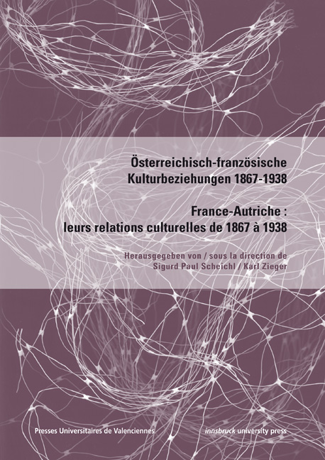 "Weitere franzöische Schwerpunkte werden im vorliegenden deutsch-französischen Sammelband etwa von Jacques Le Rider mit „L’Autriche-Hongrie dans les discours savants français de 1867 à 1914“ oder Irène Cagneau mit „Regards politiques et diplomatiques sur l’Autriche dans la Revue des Deux Mondes (1867-1914)“ gesetzt. Marc Lacheny beschäftigt sich mit den wechselseitigen Diskursen über Burgtheater und Comédie Française von Laube (1849) zu Wildgans (1931), Sylvie Arlaud wiederum schreibt über das Österreichische Museum für Kunst und Industrie im internationalen Vergleich. Einblicke. in den französischen Rezeptionsvorgang der österreichischen Kunst und Kunstgeschichte. Der zweisprachige Band ist beim Universitätsverlag Innsbruck 2012 erschienen und enthält noch viele weitere Beiträge zum Thema."