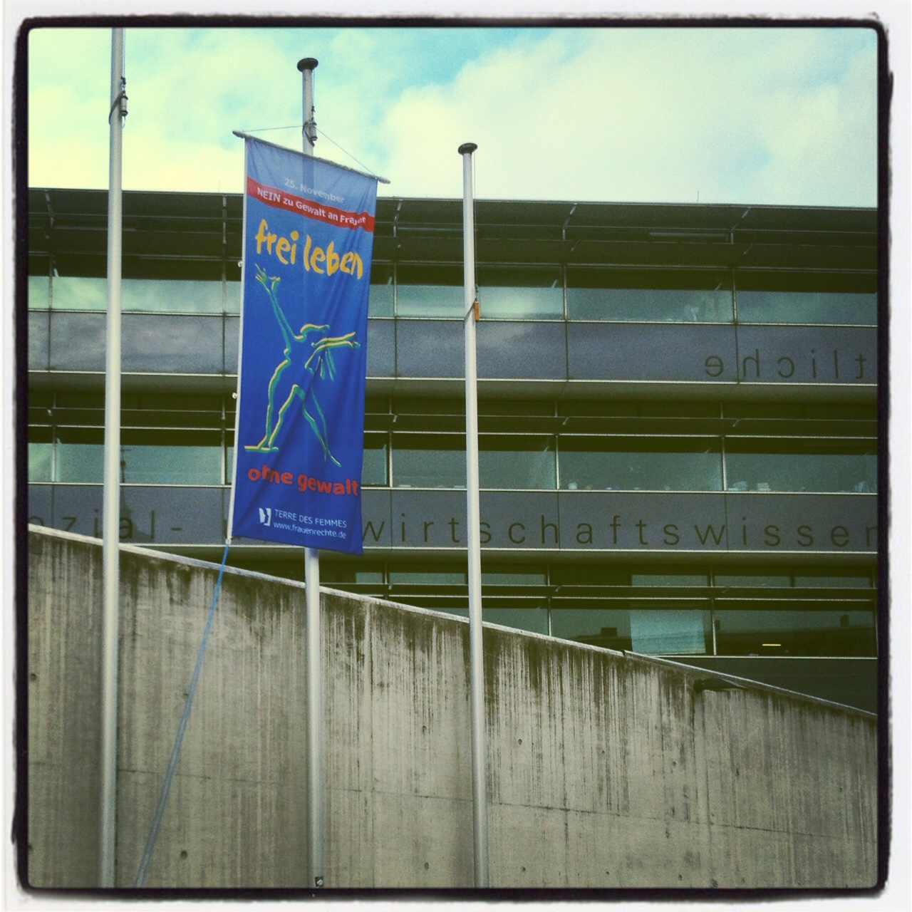 Seit 2014 beteiligt sich die Universität Innsbruck - auf Initiative des Büros für Gleichstellung und Gender Studies - an der Fahnenaktion "Nein zu Gewalt an Frauen" von Terre de Femmes. Diese Fahnenaktion ist Teil weltweiten Kampagne "16 Tage gegen Gewalt an Frauen", die alljährlich am 25. November beginnt und am 10. Dezember endet. An der Universität Innsbruck werden an drei Unistandorten (am Hauptgebäude Innrain, am USI und an der SoWi) Fahnen als Symbol für eine gewaltfreies Miteinander aufgezogen.
