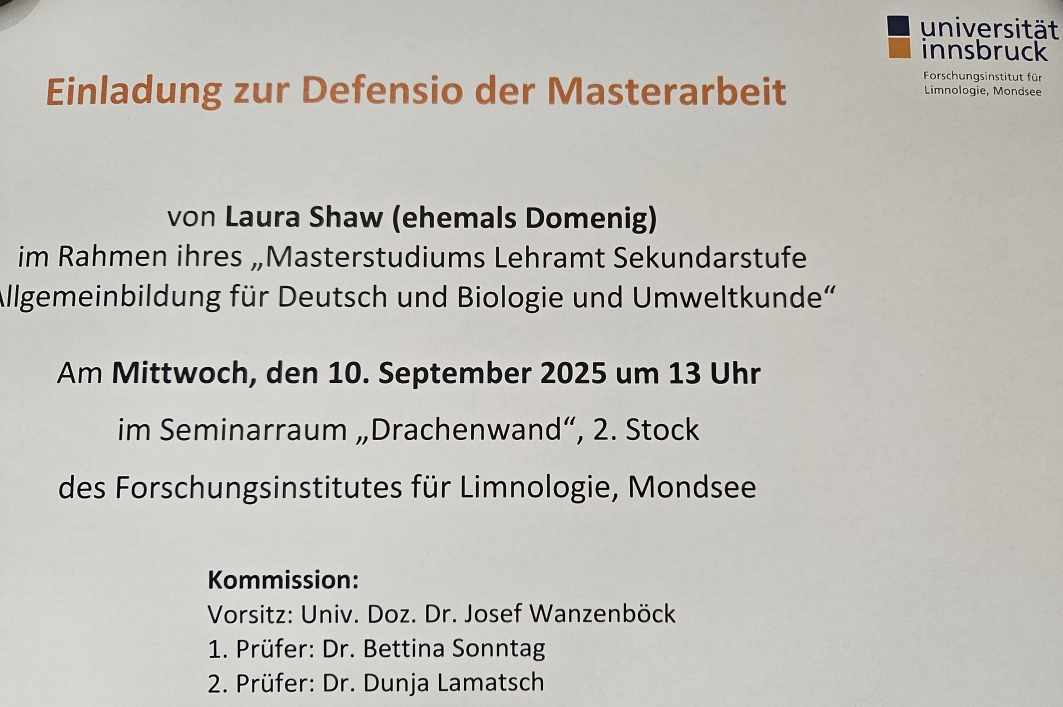Einladung zur Defensio zweier Masterstudierenden am Mondsee