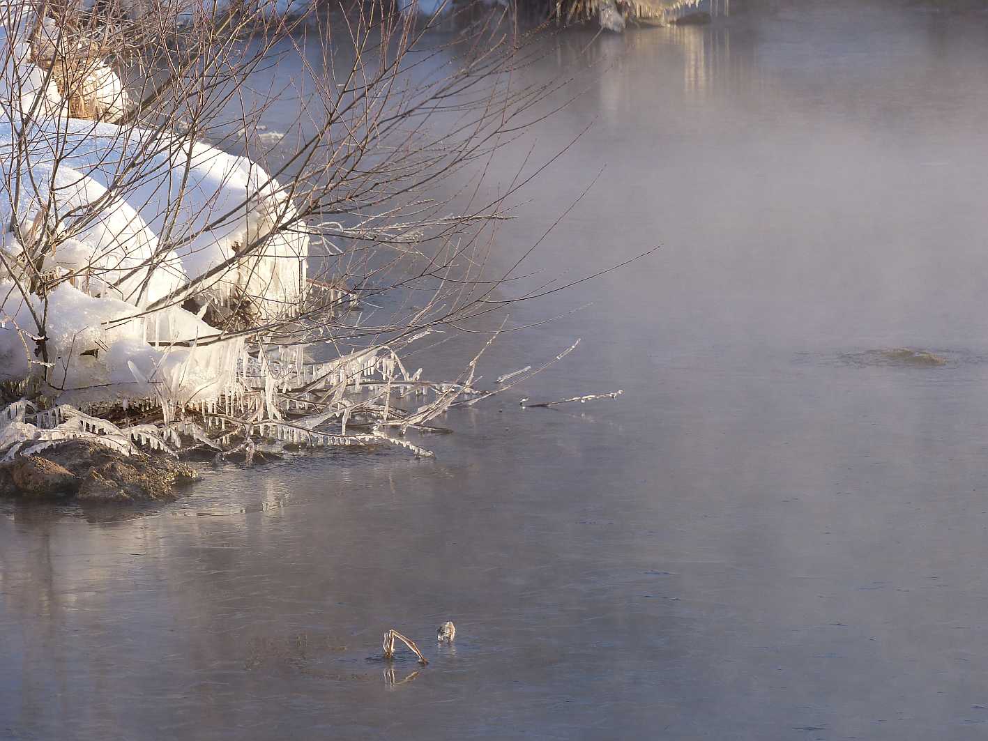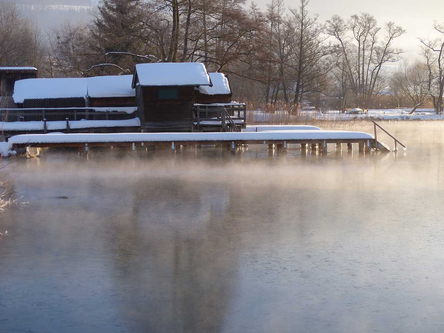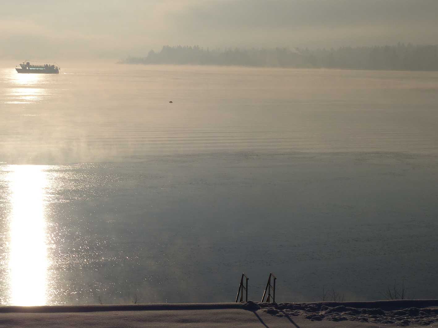 Ausflugsschiff am Mondsee mit Eisflaeche