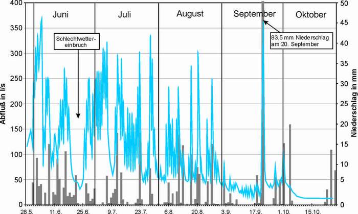 Hydrograph (blue line, scale at left) of the meltwater stream released from Reichenkar rock