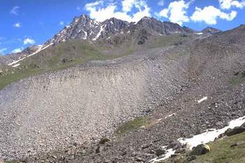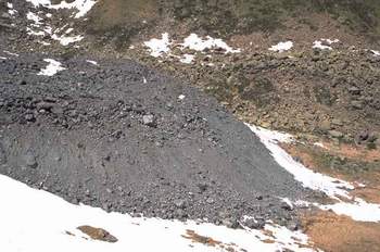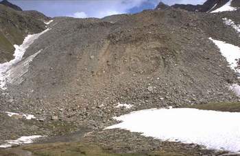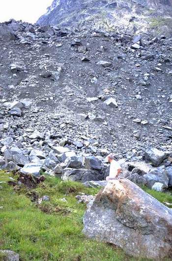 Steep front slope of the active rock glacier in Hinteres Langtal Kar (Schobergruppe), with a small spring in the middle of the front slope (arrow) and rock glacier spring at the foot of the front slope. |
