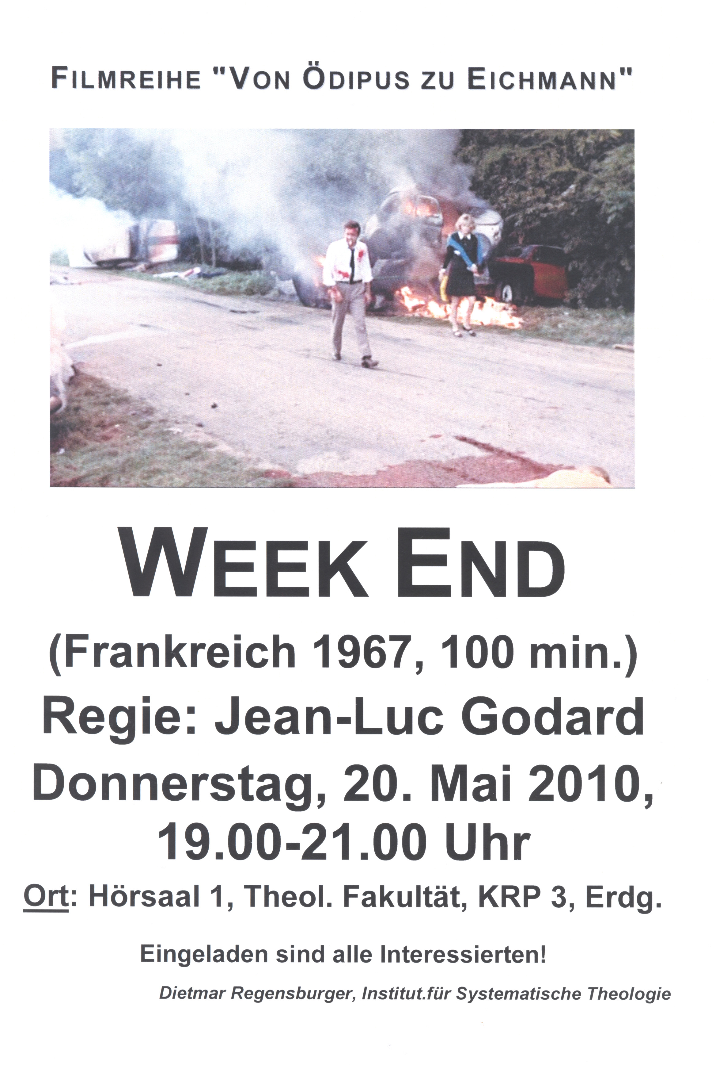 - 20. Mai 2010, 19.00-21.00 Uhr: Filmvorführung "WEEK END" aus der Filmreihe "Von Ödipus zu Eichmann" im Hörsaal 1 der Theologischen Fakultät (Karl-Rahner-Platz 3, Parterre)