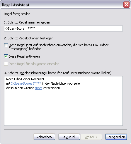 Klicken Sie 2-mal auf weiter, benennen die erstellte Mailregel wie dargestellt und schließen den Regel-Assistent mit fertig stellen.